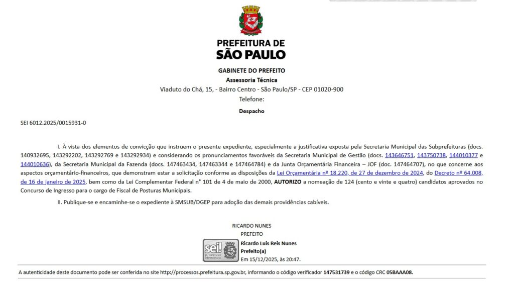 Para encerrar os trabalhos do SAVIM em 2025, foi autorizada a nomeação de 124 candidatos aprovados no concurso público para o cargo de Fiscal de Posturas Municipais do Município de São Paulo.