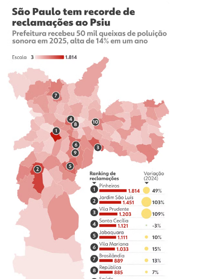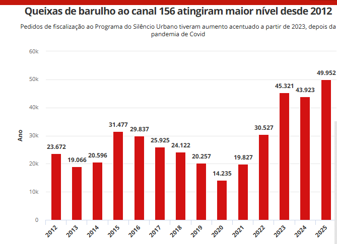 As reclamações da população de São Paulo ao Programa do Silêncio Urbano (Psiu), da prefeitura, bateram recorde em 2025. Foram quase 50 mil queixas registradas ao longo do ano, um aumento de 14% em relação a 2024 e de 111% na comparação com 2012, início da série histórica.
